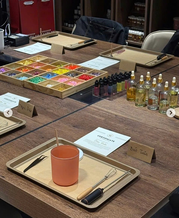 Cung cấp các workshop nến thơm dành cho cá nhân — bạn sẽ được học cách làm từ nguyên liệu tự nhiên, chọn mùi, màu sắc, trang trí để tạo ra một hũ nến mang dấu ấn cá nhân